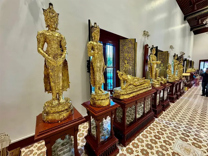 The centerpiece of the main hall is the majestic golden statue of Phra Chao Attarot. Made of brass, the statue is large and gleaming with gold. He sits on a high pedestal, his hands in a mudra (hand gesture), his eyes gazing into the distance, exuding compassion and serenity. Beside him stand two dignified disciples, creating a harmonious and balanced overall scene.